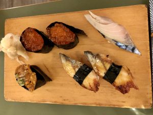 Unvergesslich bleiben einem Gerichte wie die gesottenen Auberginen in Orangen-Miso-Sauce in guter Erinnerung. Gleichermaßen ebenso: Battera, in einem Kästchen gepresster Reis mit fermentierter Makrele, Negitoro, einem Tatar von Thunfisch mit Lauchzwiebeln. Ein besonderes Geschmackserlebnis war einem beim Erstkontakt eines kalten Sake im Zedernholz-Kästchen vergönnt. Selbst das Horenso No Goma-Ae, gekochter Spinat mit nappierter Sesam-Creme unterschied sich deutlich in der Art der Zubereitung im Vergleich zu anderen Lokalen.