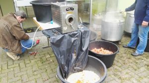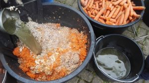 Vor Ort denkt man allerdings in anderen Dimensionen. Die ersten Arbeiten begannen bereits um 6:00 Uhr morgens. Dabei wurden 150 kg Hähnchenbollen, 100 kg Möhren, Multifitflocken, 40 kg Hähnchenflügel gekocht, um für die Wursterei ab 9:00 Uhr bereit zu stehen.