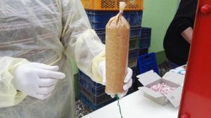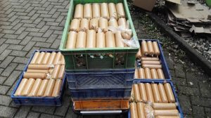 Nachdem nun alles gekocht ist, kommt es in den Fleischwolf. Die Masse wird verrührt und mit den Futterzusätzen gemischt. Dann wird gewurstet. Die Würste – rund 460 Stück zzgl. kleinere Portionsbeutel – kommen anschließend in die Kühltruhe, um sie bei Bedarf herauszunehmen. Die gekochten Hühnerflügel übrigens werden von den Igeln gerne als kleine Knabberei genommen. Sie werden als Ganzes eingefroren.