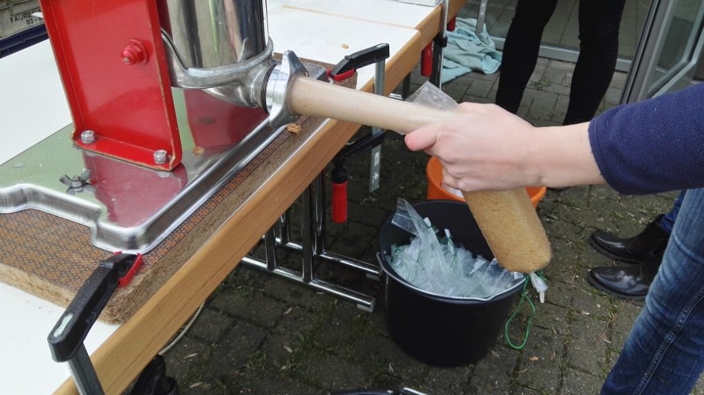 Nachdem nun alles gekocht ist, kommt es in den Fleischwolf. Die Masse wird verrührt und mit den Futterzusätzen gemischt. Dann wird gewurstet. Die Würste – rund 460 Stück zzgl. kleinere Portionsbeutel – kommen anschließend in die Kühltruhe, um sie bei Bedarf herauszunehmen. Die gekochten Hühnerflügel übrigens werden von den Igeln gerne als kleine Knabberei genommen. Sie werden als Ganzes eingefroren.