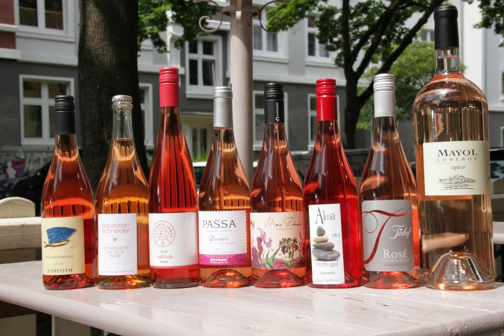 Bild: Gruppenfoto von Rosé-Weinen aus dem aktuellen Bestand der Weinhandlung Cabernet & Co. in Dortmund. – © – Copyright Manfred Tari
