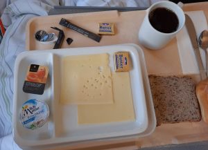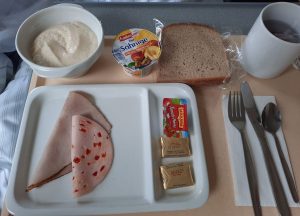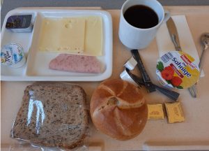 Der Pfefferminztee war dem gestrigen Früchtetee haushoch überlegen. Warum ich wieder zwei Stück Butter bekommen habe, obwohl ich ausdrücklich nur eins bestellt hatte, weiß vermutlich nur der EU-Butterberg. Der gemischte Aufschnitt… naja, okay halt, der Käse wie immer mit der Konsistenz von Acryl-Dichtstoffmasse, aber halt: die Scheibe mit Bärlauch war weniger austauschbar und sogar lecker. Es fehlte das bestellte Apfelmus.