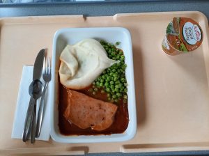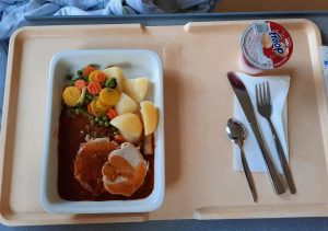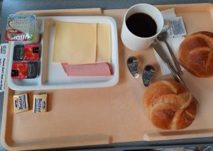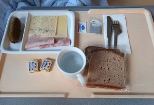 Nächste Runde: Abendessen. Der potthässliche, nach PU-Schaum aussehende Grießbrei schmeckte überraschend gut, leicht vanillig, die Konsistenz wie ein schlotziges Risotto. Die Wurstauswahl… naja. Das Graubrot erwartbar wabbelig. Joghurt okay. Früchtetee ungenießbar. Mir ist langweilig.