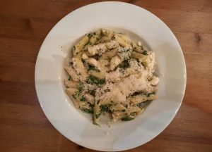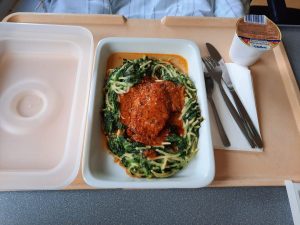 Man glaubt es nicht, ist aber so: das Mittagessen ist wirklich schmackhaft. Hähnchenbrust mit einer pikanten Kräutersauce gewürzt, dazu tatsächlich leckere Nudeln (al dente!) mit Blattspinat. Okay, Spaghetti kleinzuschneiden könnte als Frevel angesehen werden. Aber vermutlich pfeifen die jungen Wilden in der Großküche einfach auf Konventionen.
