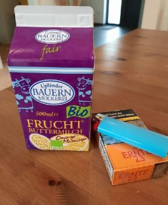 Damit ihr heute nicht ganz ohne bildlichen Eindruck meiner Ernährungsgewohnheiten bleibt, hier ein Foto des Mittagessens. Wie alles von der Upländer Bauernmolkerei ist die Fruchtbuttermilch sehr zu empfehlen. Mal abgesehen vom Erfrischungsfaktor und dem fruchtig-definierten Geschmack, bietet sie Mehrwert durch faire Milchpreise für eine Genossenschaft von Bio-Bauern aus der Region. Sozusagen das Indie-Label unter den Molkereien. Zum Nachtisch traditionelle Rauchwaren aus dem Hause Reemtsma.